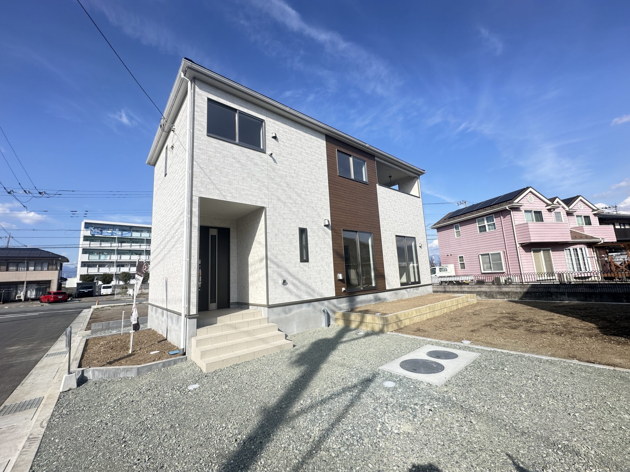 ☆住宅性能表示W取得☆ 新築一戸建て 中央市西花輪 2号棟 2階建 4LDK +カースペース3台 外構付き 耐震等級3+長期優良住宅取得 田富南小学校(徒歩8分)+田富中学校(徒歩16分) 新価格2790万円
